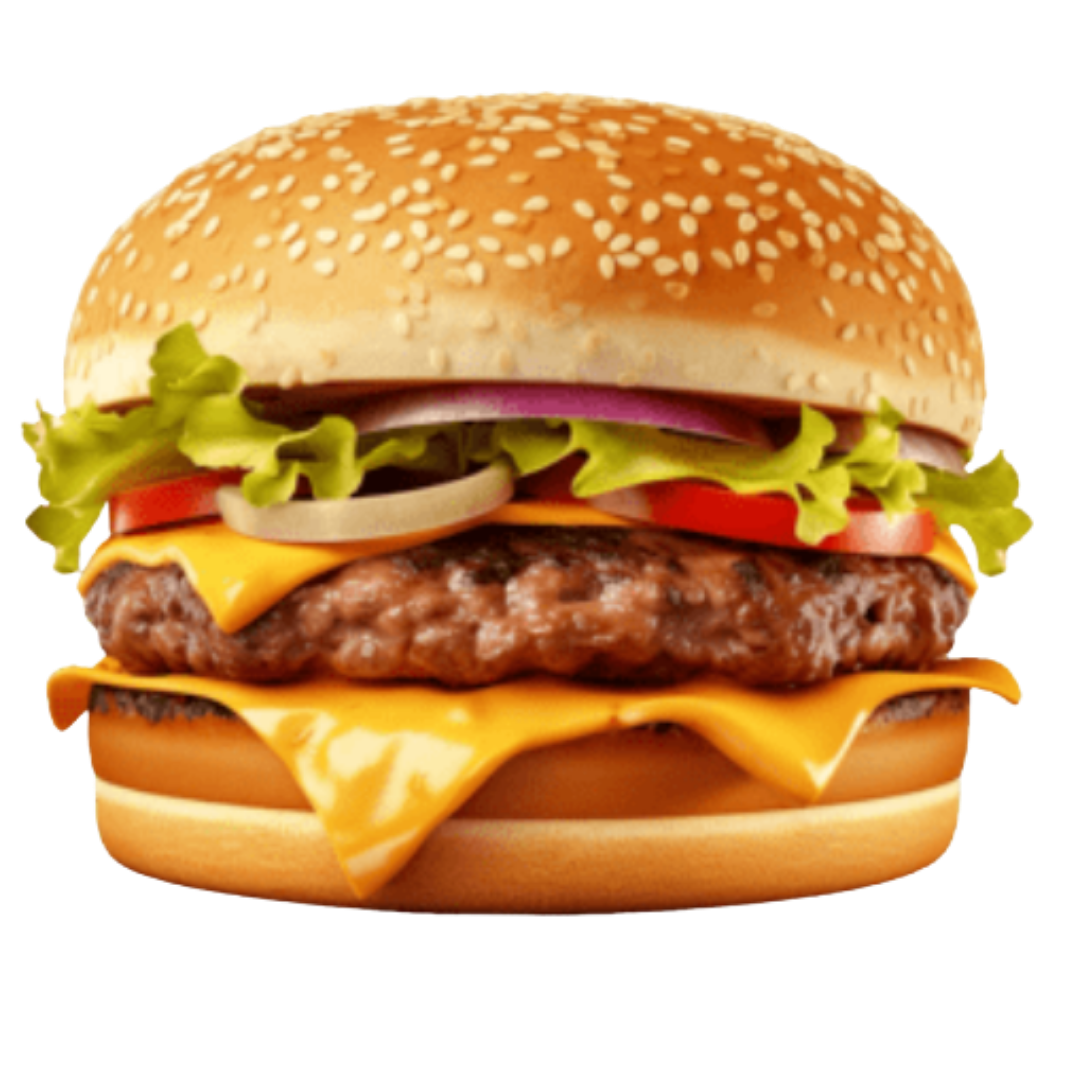 Steak 90g, bacon, cheddar, emmental salade, tomates, oignons, cornichons