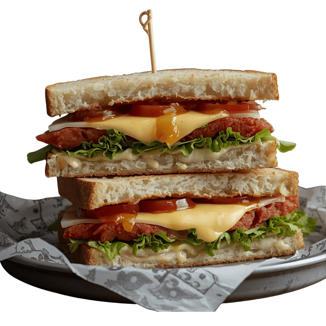 2 chickens, 2 cheddar, galette rosti. Servis avec salade et tomates.